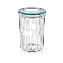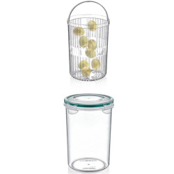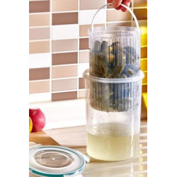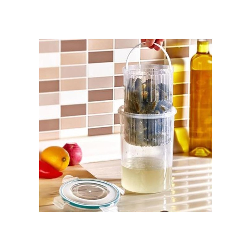 Zeytinlerinizi, küçük boy domates ve salatalıklarınızı kolaylıkla yıkayıp suyunu süzebileceğiniz, kovası ile sonrasında saklamak üzere içine yerleştirebileceğiniz saklama kabı çok kullanışlı ve her mutfakta bulunması gereken parçalardan